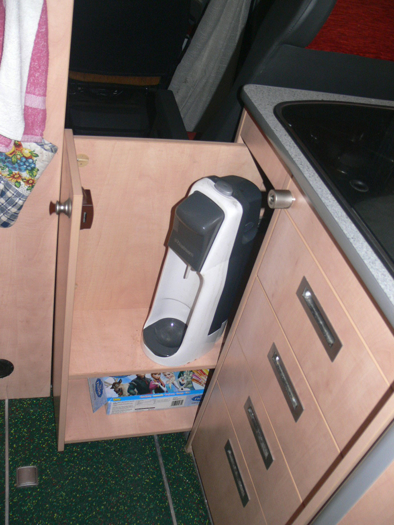 Kuchyňka je vybavena kombinovaným dvojvařičem s dřezem který je krytý i s baterií kaleným sklem a 80l trojkombinační lednicí Thereford s 10l mrazákem.
