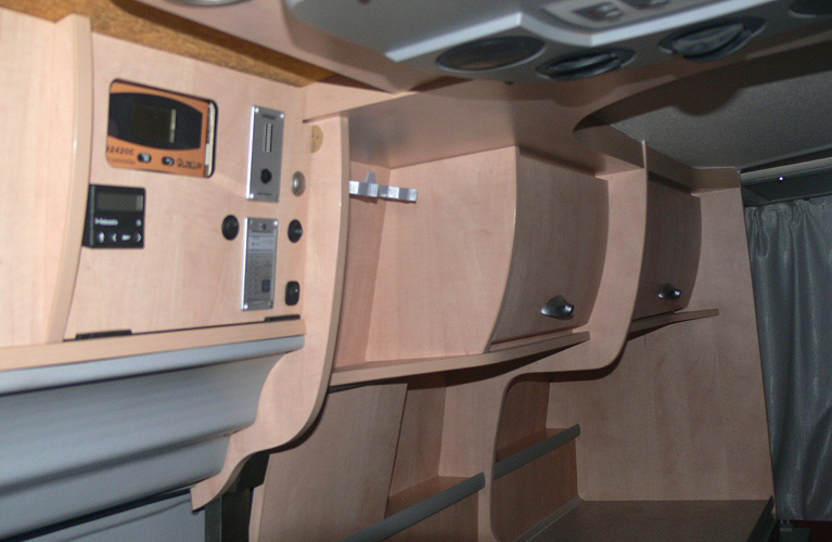 Mimo běžné elektro výbavy 230V/12V je vůz vybaven informativním měření čisté i odpadní vody, měření LPG a napětí solárního panelu i trakční baterie.