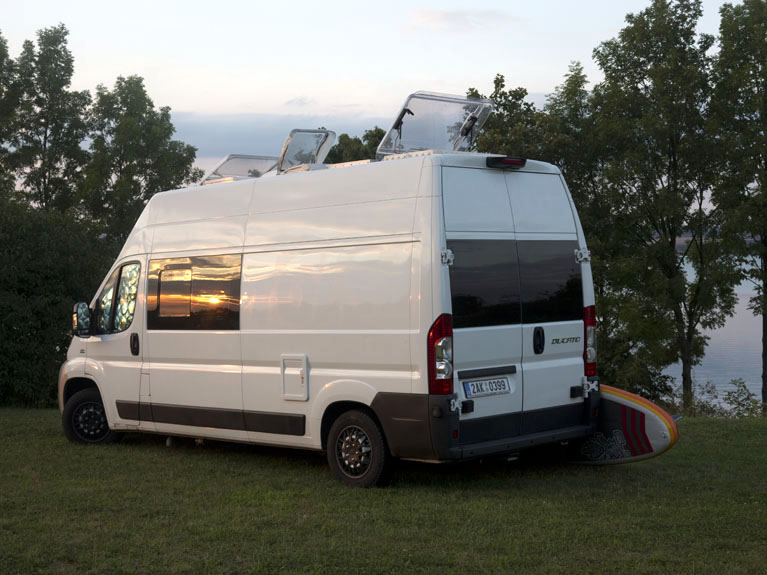Posuvné + pevné boční okno je vybavené zatmavovací folií a přispívá k nenápadnému vzhledu vozidla. Tři střešní okna SEITZ 40×40 v koupelně, 70×50 v přední části vozu nad palandou a 90×70 nad zadním lůžkem zajistí dostatečné větrání i prosvětlení interieru. Všechna jsou vybavena moskytiérou a sluneční roletkou.